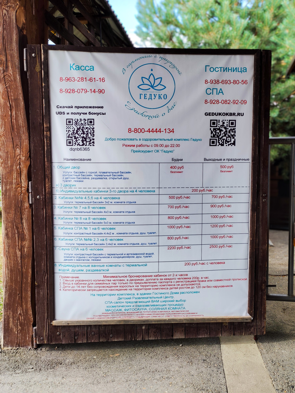 туризм путешествия отдых курорт термальный комплекс инфраструктура сервис общественное место гедуко информация информационный стенд объявление прайс лист прейскурант услуги цены тарифы расписание режим работы контакты телефон QR код сайт GEDUKOKBR RU Гедуко оздоровительный комплекс СПА сауна бассейн кабинки касса гостиница наружная информация клиентский сервис навес деревянная рама публичная информацияПохожие фотографии