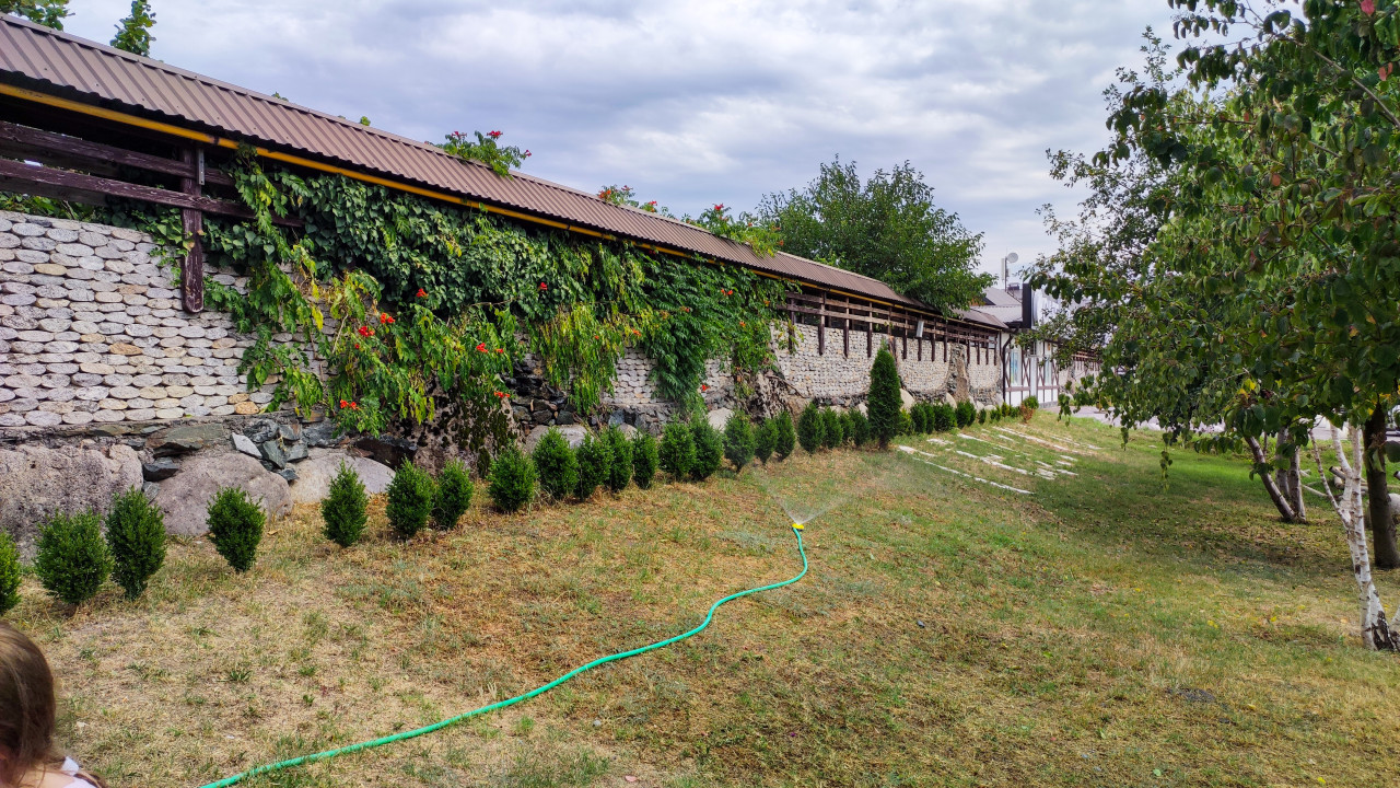 туризм путешествия отдых курорт термальный комплекс инфраструктура сервис общественное место гедуко ландшафт благоустройство озеленение газон полив садовый шланг распылитель вода уход за территорией каменная стена каменная кладка ограда забор вьющиеся растения лиана зелень красные цветы хвойные кустарники посадки двор территория комплекса архитектурные детали кровля деревянные балки пасмурное небо садоводство парковая зона летоПохожие фотографии