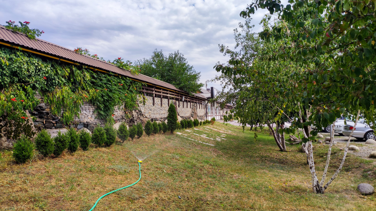 Широкий вид дворовой территории: слева протяжённая каменная стена с коричневой кровлей и деревянными перилами сверху, по фасаду спускаются густые вьющиеся растения с зелёной листвой и редкими красными цветами. У основания высажены небольшие хвойные кусты, на газоне видны полосы выложенных плит и зелёный шланг с работающим распылителем, поднимающим мелкую водяную пыль. Справа растут деревья с тонкими стволами, за ними припаркованы легковые автомобили на грунтовой площадке. Небо облачное, свет дневной. Фото можно использовать для тем благоустройства, озеленения и обслуживания территории у туристических комплексов.