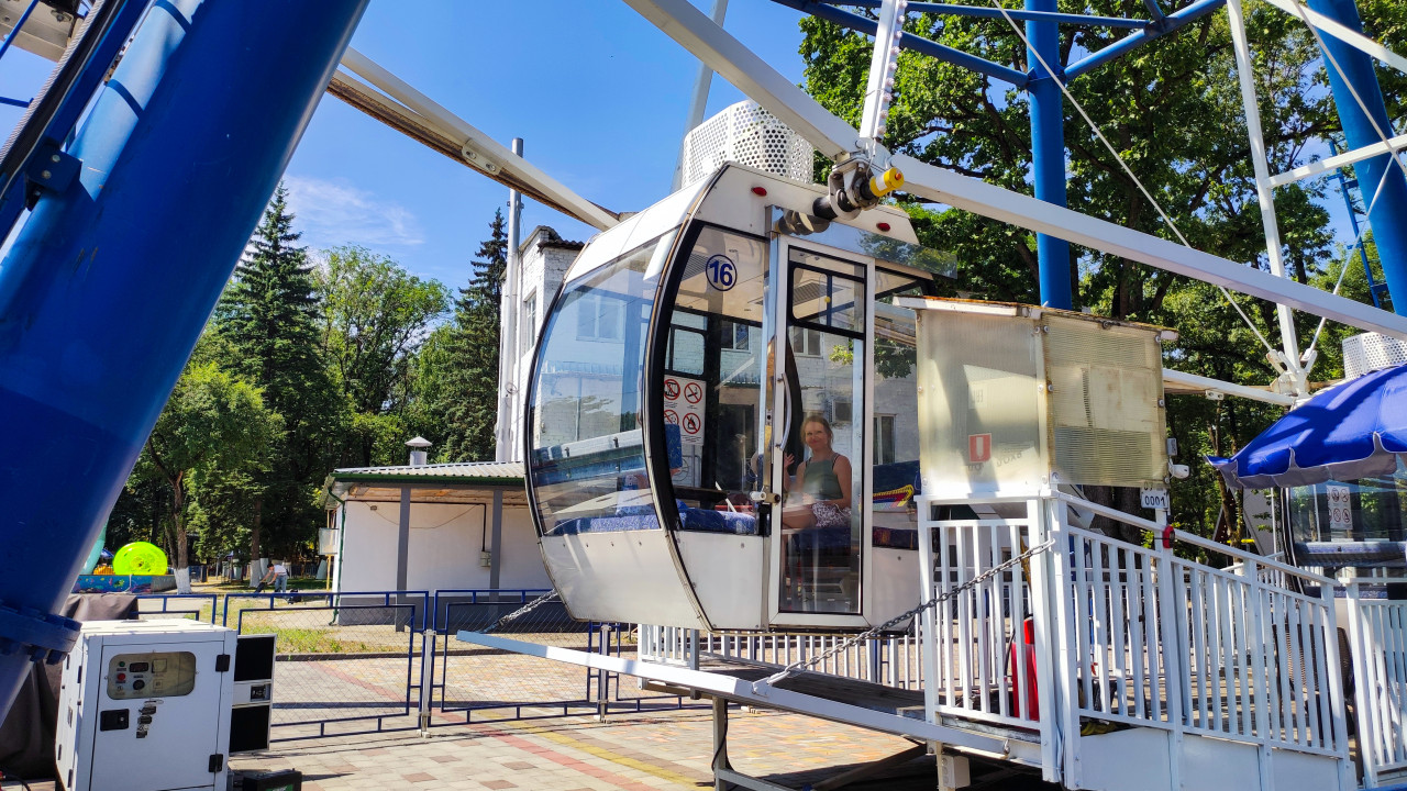 парк городской парк парк развлечений аттракционы детские аттракционы развлечения досуг семейный отдых общественное место городская среда инфраструктура колесо обозрения аттракцион кабина посадка платформа ограждение безопасность пиктограммы панорамные окна стекло металлическая конструкция опоры синий металл фермы механизм туризм лето ясная погода дневной свет посетители развлекательная зона техника инженерия городской отдыхПохожие фотографии