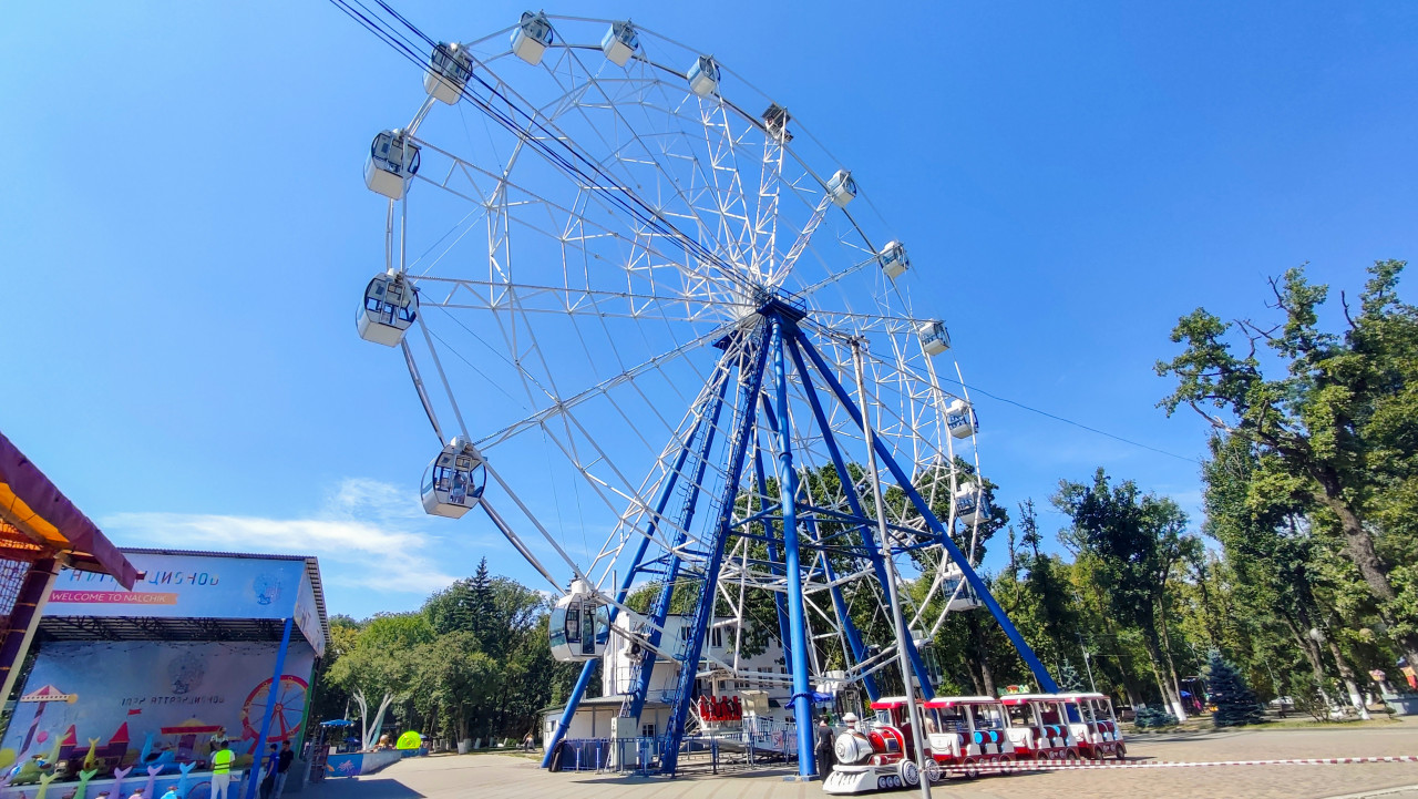 парк городской парк парк развлечений аттракционы детские аттракционы развлечения досуг семейный отдых общественное место городская среда инфраструктура парк аттракционов аттракцион колесо обозрения карусель отдых туризм путешествия лето солнечный день голубое небо деревья аллея ограждение посадочная площадка кабины высота панорама города уличная фотография сезонные развлечения прогулкаПохожие фотографии