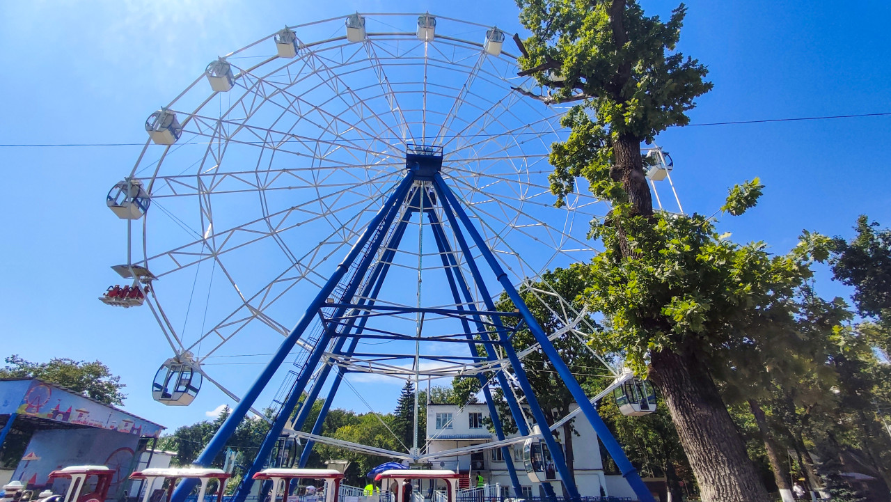 парк городской парк парк развлечений аттракционы детские аттракционы развлечения досуг семейный отдых общественное место городская среда инфраструктура колесо обозрения карусель отдых лето голубое небо деревья крона деревьев высота панорамный аттракцион кабины металлическая конструкция инженерия геометрия линии перспектива уличная фотография туризм путешествия семейный досуг безопасность прогулка дневной светПохожие фотографии