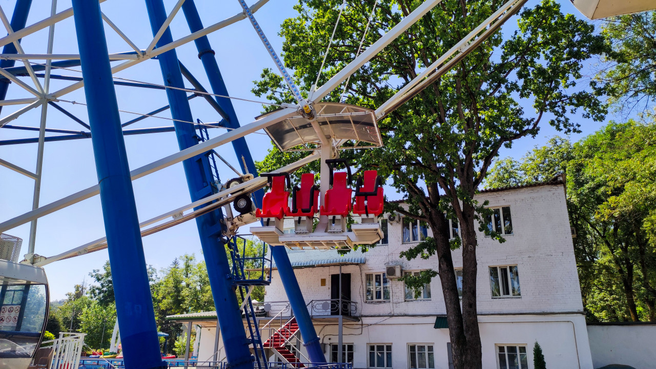 Июль 2024. Кадр с низкой точки: в центре видны подвесные красные кресла аттракциона, закреплённые на металлической балке, а на заднем плане проходят белые элементы конструкции колеса обозрения и синяя опора. Рядом попадает фасад здания и зелёные деревья, свет яркий, тени контрастные. Снимок акцентирует детали посадочных мест, крепления и сочетание разных аттракционов на одной площадке. Фото подойдёт для материалов о безопасности и устройстве аттракционов, обзоров парков развлечений, летнего городского досуга и туристической инфраструктуры.