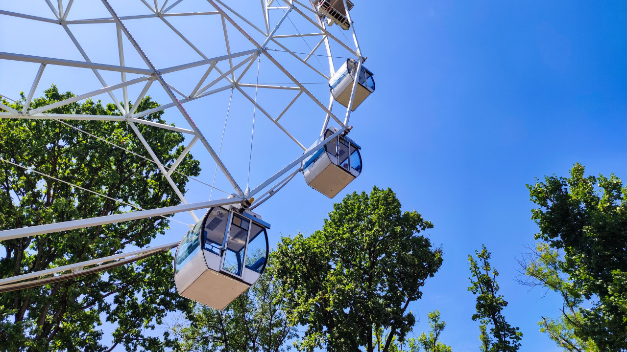 парк городской парк парк развлечений аттракционы детские аттракционы развлечения досуг семейный отдых общественное место городская среда инфраструктура путешествия город отдых колесо обозрения панорамный аттракцион кабинка кабины колеса обозрения стеклянная кабина высота обзор конструкция металлический каркас белые спицы лето июль ясное небо голубое небо деревья зелёная крона городской пейзаж туризм прогулкаПохожие фотографии