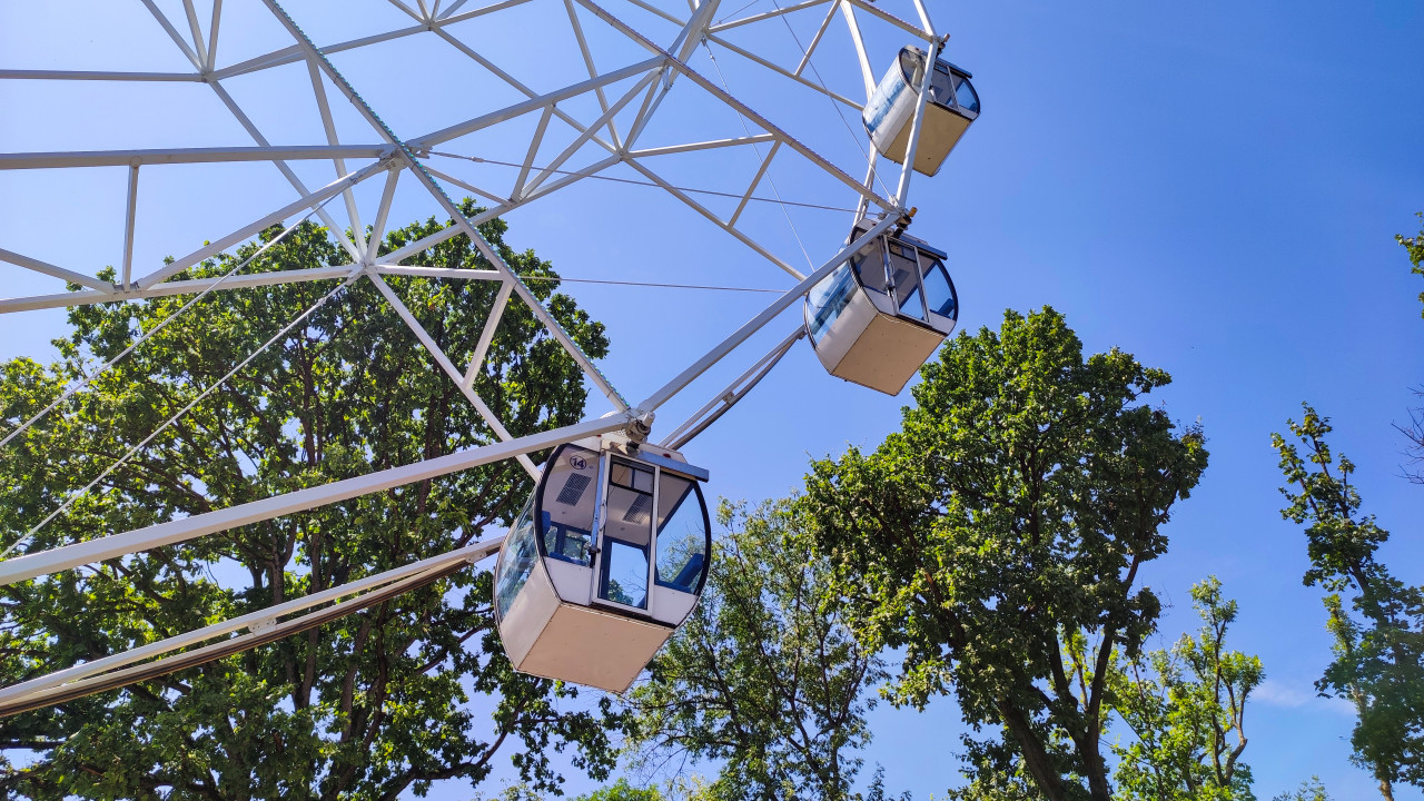 парк городской парк парк развлечений аттракционы детские аттракционы развлечения досуг семейный отдых общественное место городская среда инфраструктура колесо обозрения кабина панорамная кабина высота конструкция металл инженерия крепления безопасность отдых туризм путешествия лето голубое небо деревья зелень крона деревьев детали крупный план перспектива уличная фотография семейный досуг городские развлеченияПохожие фотографии