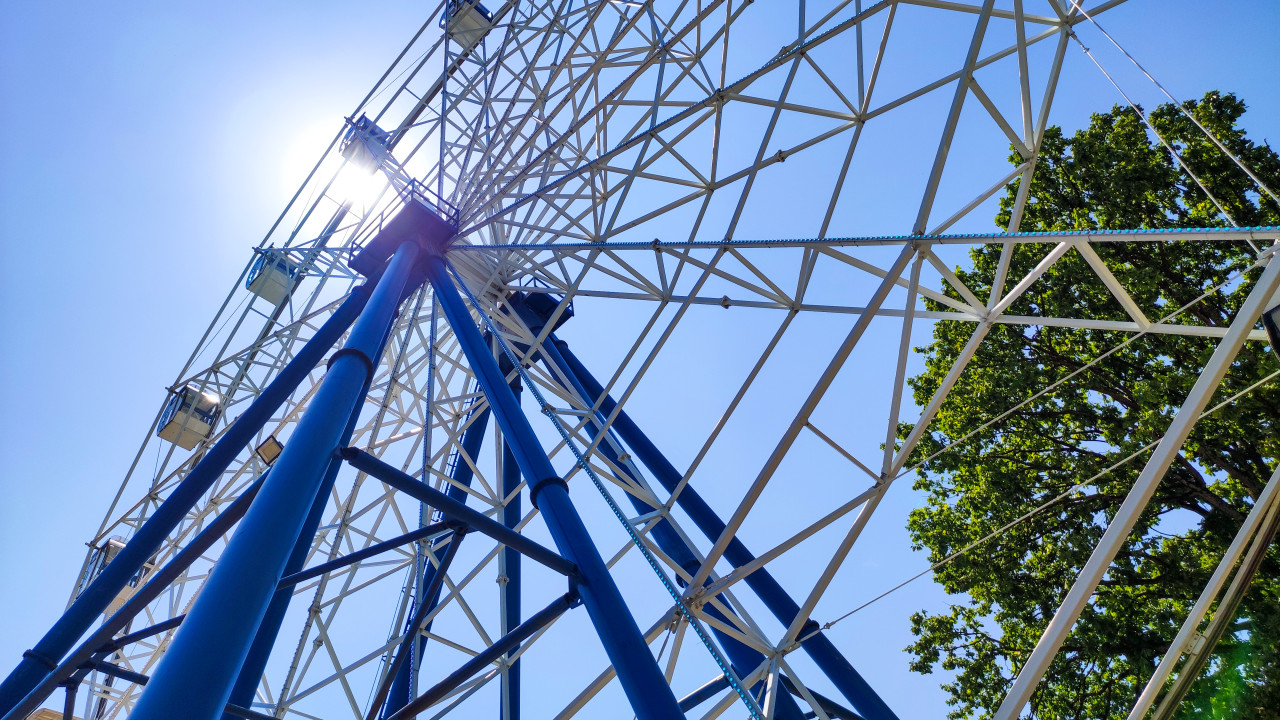 парк городской парк парк развлечений аттракционы детские аттракционы развлечения досуг семейный отдых общественное место городская среда инфраструктура путешествия город отдых колесо обозрения конструкция металлоконструкция инженерия архитектура геометрия спицы каркас опоры синие опоры контровой свет солнечный блик солнечные лучи голубое небо лето июль деревья зелень высота панорамный аттракцион городской туризм прогулкаПохожие фотографии