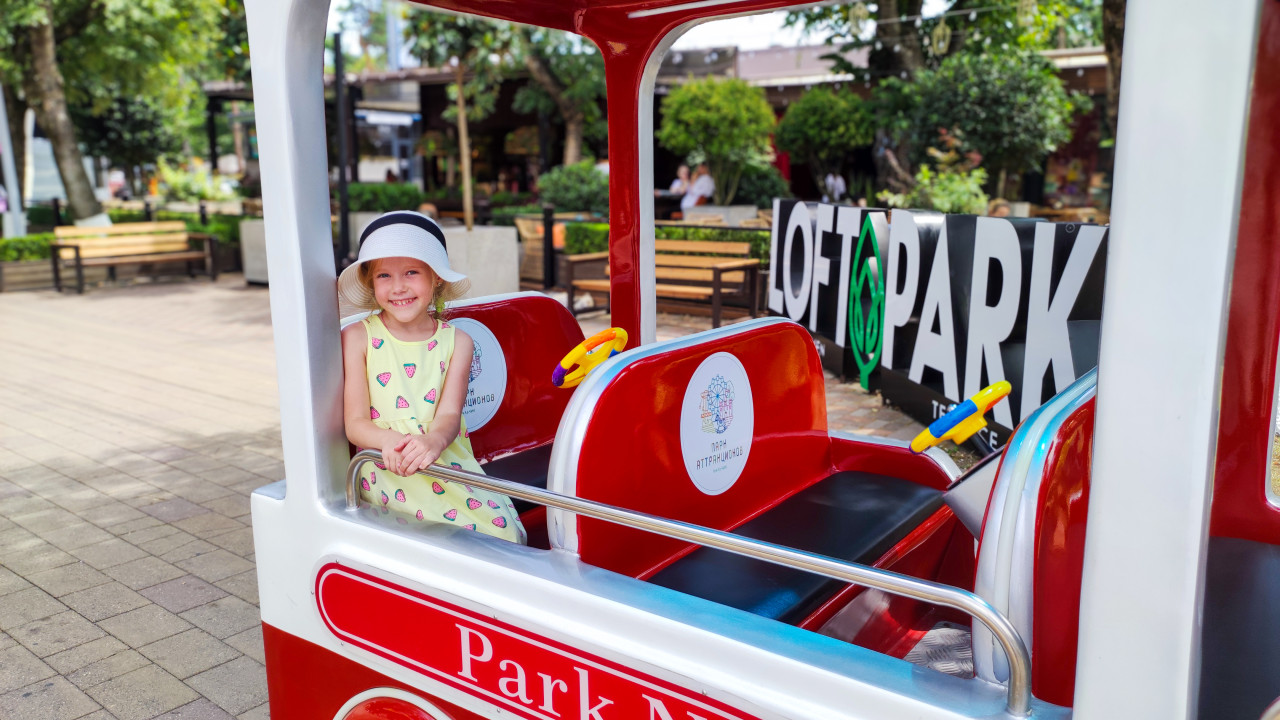 На снимке девочка в летнем платье и светлой шляпе стоит рядом с красно-белой кабиной детского аттракциона в Городском парке Нальчика. Внутри кабины видны сиденья, металлические поручни и жёлтые рули, на спинках наклейки парка аттракционов. На заднем плане расположена мощёная площадка, лавочки и озеленение, а также объёмная вывеска LOFT PARK. В глубине кадра посетители и летняя зона отдыха под деревьями. Съёмка выполнена днём летом. Фото подходит для тем о семейных прогулках, детских развлечениях, городской среде и туризме в Нальчике.