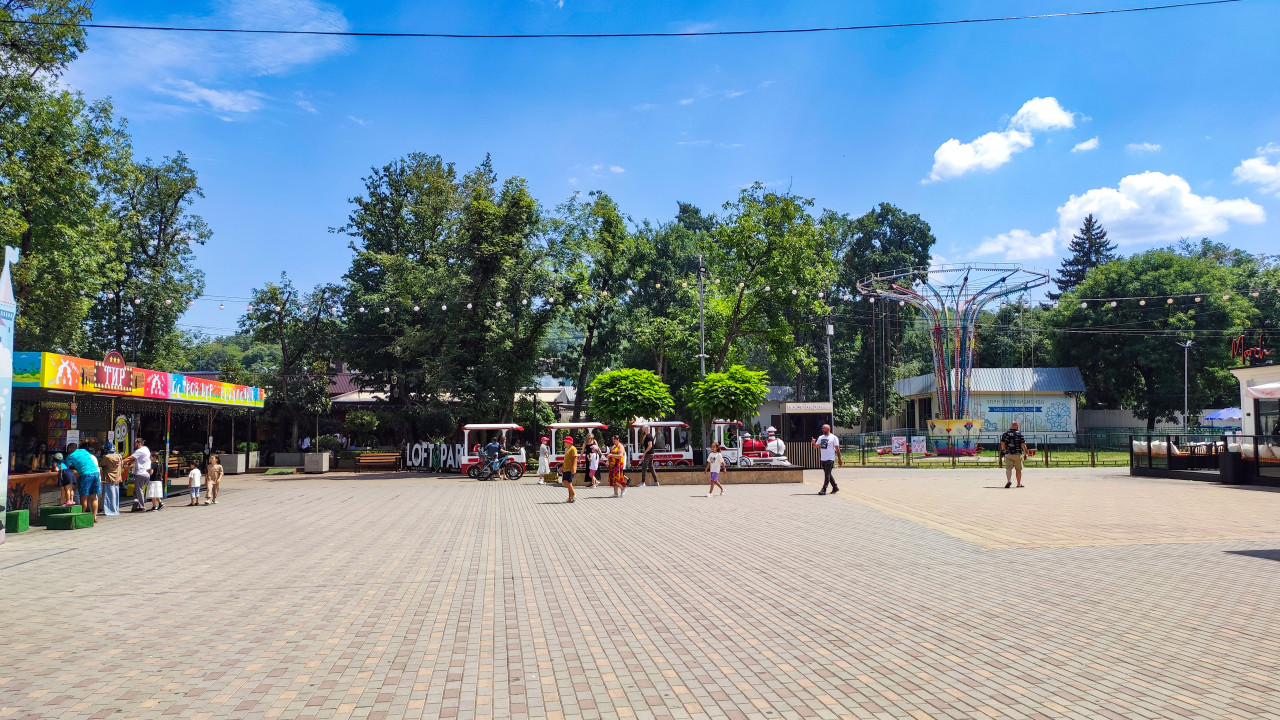 Площадь парка аттракционов Нальчика с киосками и детским поездом