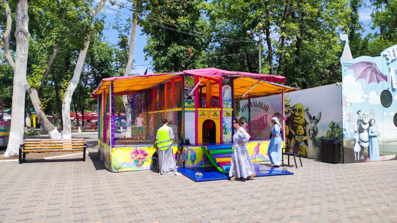 парк городской парк парк развлечений аттракционы детские аттракционы развлечения досуг семейный отдых общественное место городская среда инфраструктура Россия Кабардино Балкария Кабардино Балкарская Республика Нальчик парк аттракционов батут надувной аттракцион игровая зона детская площадка дети безопасность защитная сетка уличные аттракционы яркие цвета мультперсонажи павильон лабиринт общественное пространство брусчатка лето дневной свет туризм прогулкаПохожие фотографии