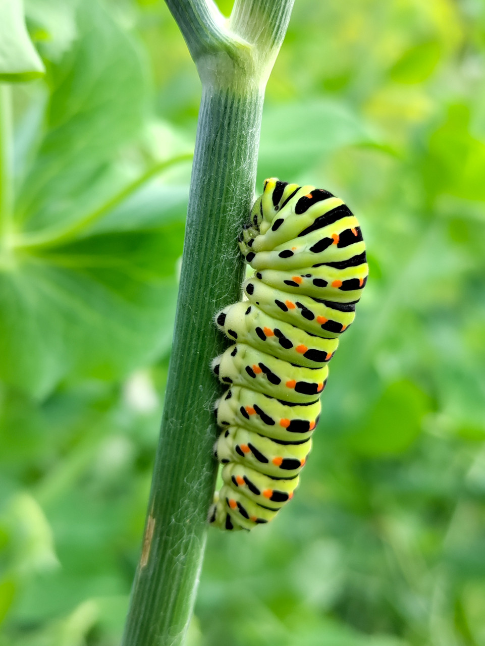 На фотографии запечатлена гусеница махаона, удерживающаяся на гладком зелёном стебле. Ракурс подчёркивает округлую форму передних сегментов и контрастный рисунок: чёрные полосы и мелкие оранжевые точки на светло-зелёном фоне. В размытии видны листья и травянистая растительность, создающие природный контекст без лишних деталей. Такое изображение удобно для визуального распознавания вида и демонстрации стадии личинки перед окукливанием. Снимок можно использовать в публикациях о насекомых сада, в научно-популярных текстах, презентациях по биологии и в материалах про охрану опылителей и биоразнообразие.
