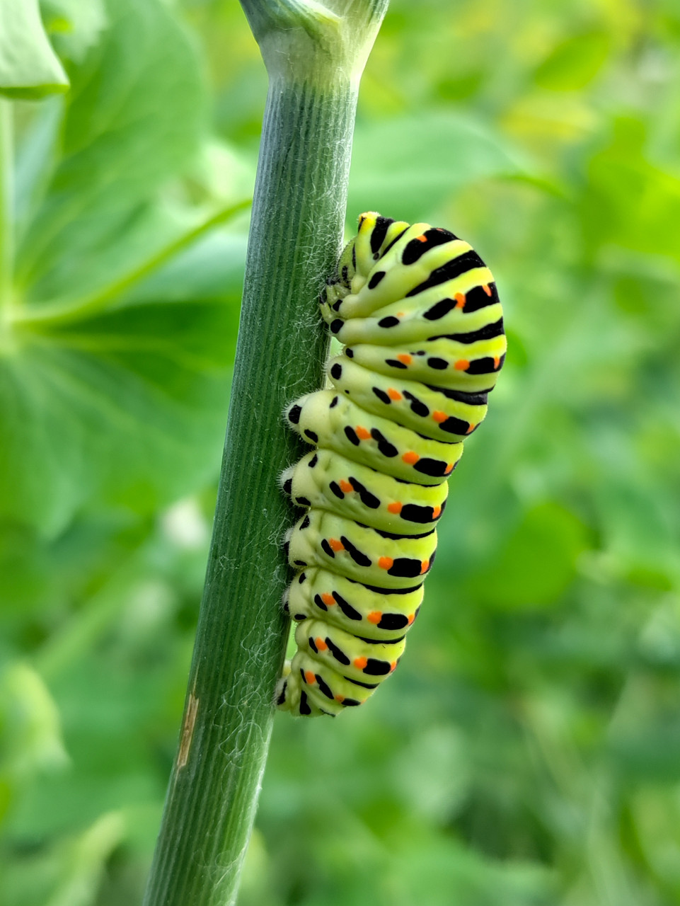 На снимке показана гусеница махаона в очень крупном плане: тело изогнуто дугой и плотно прилегает к вертикальному стеблю, хорошо заметны складки сегментов и характерный рисунок чёрных полос с оранжевыми пятнами. Задний план размытый, с преобладанием зелени, что подчёркивает объект и делает изображение наглядным для определения вида. Кадр передаёт фактуру покровов и «анатомию» личинки. Фотография подойдёт для статей о бабочках и их развитии, иллюстраций для образовательных материалов, а также для тем о садовой экологии и наблюдении за насекомыми.