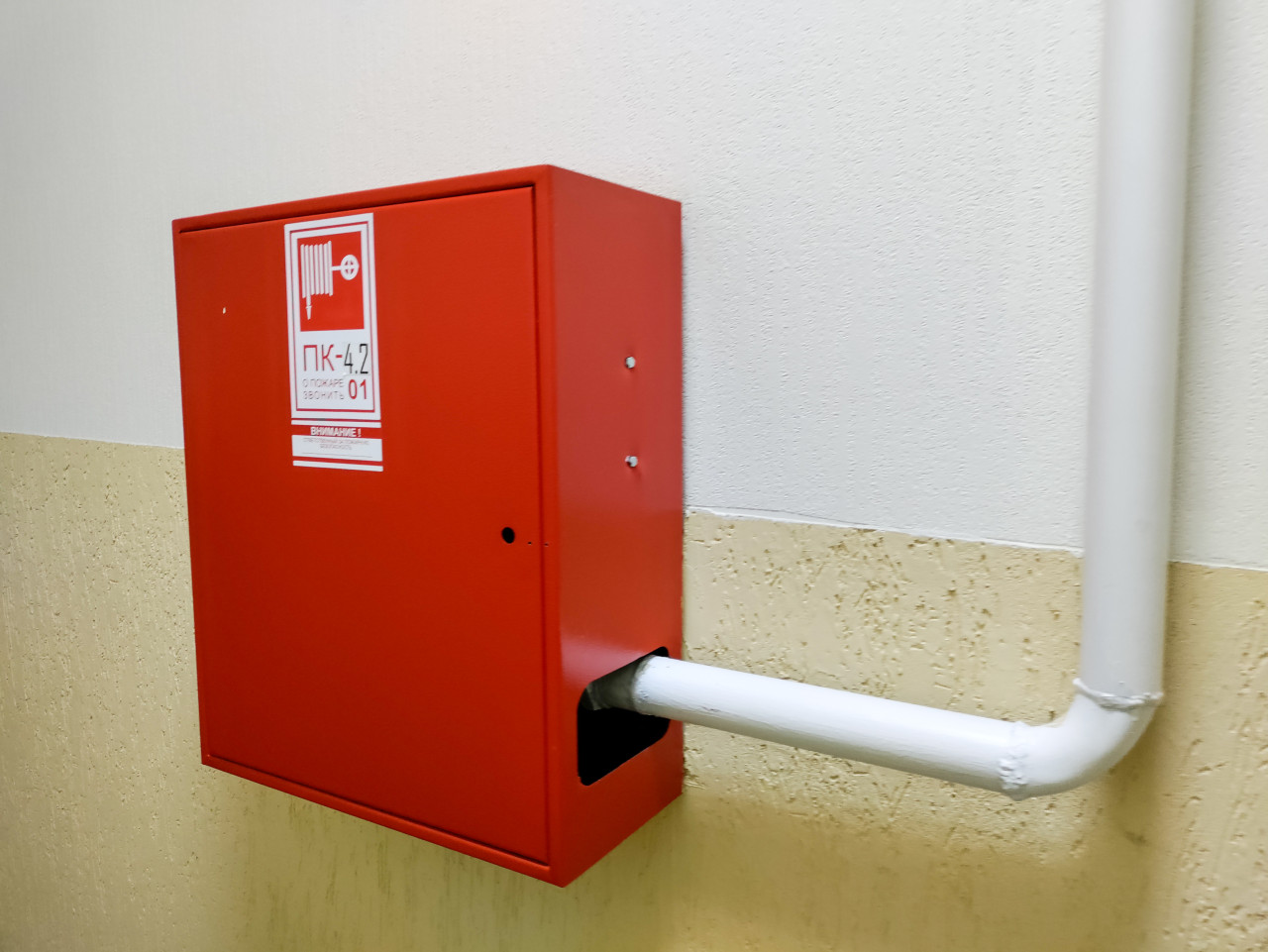 Пожарный шкаф с маркировкой ПК на стене в коридоре здания