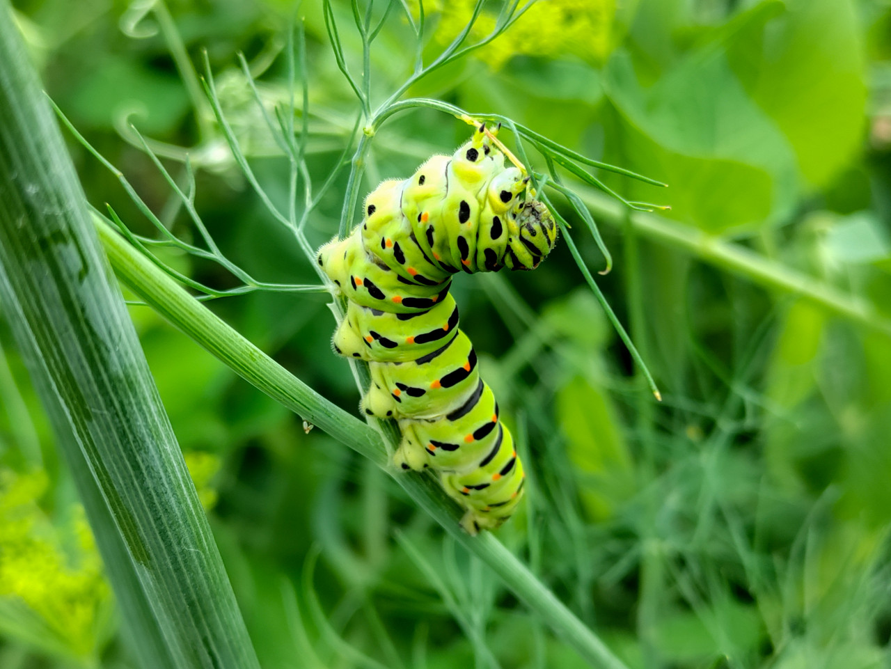 природа насекомое гусеница махаон личинка бабочки макро крупный план растение стебель листья зелёный фон сад огород энтомология биология укроп зелень дача кормовое растение поза изгиб тела питание листья укропа ажурная листва жёлтое соцветие природный фон развитие насекомых жизненный цикл экология биоразнообразие наблюдение естественная среда садовая экосистемаПохожие фотографии