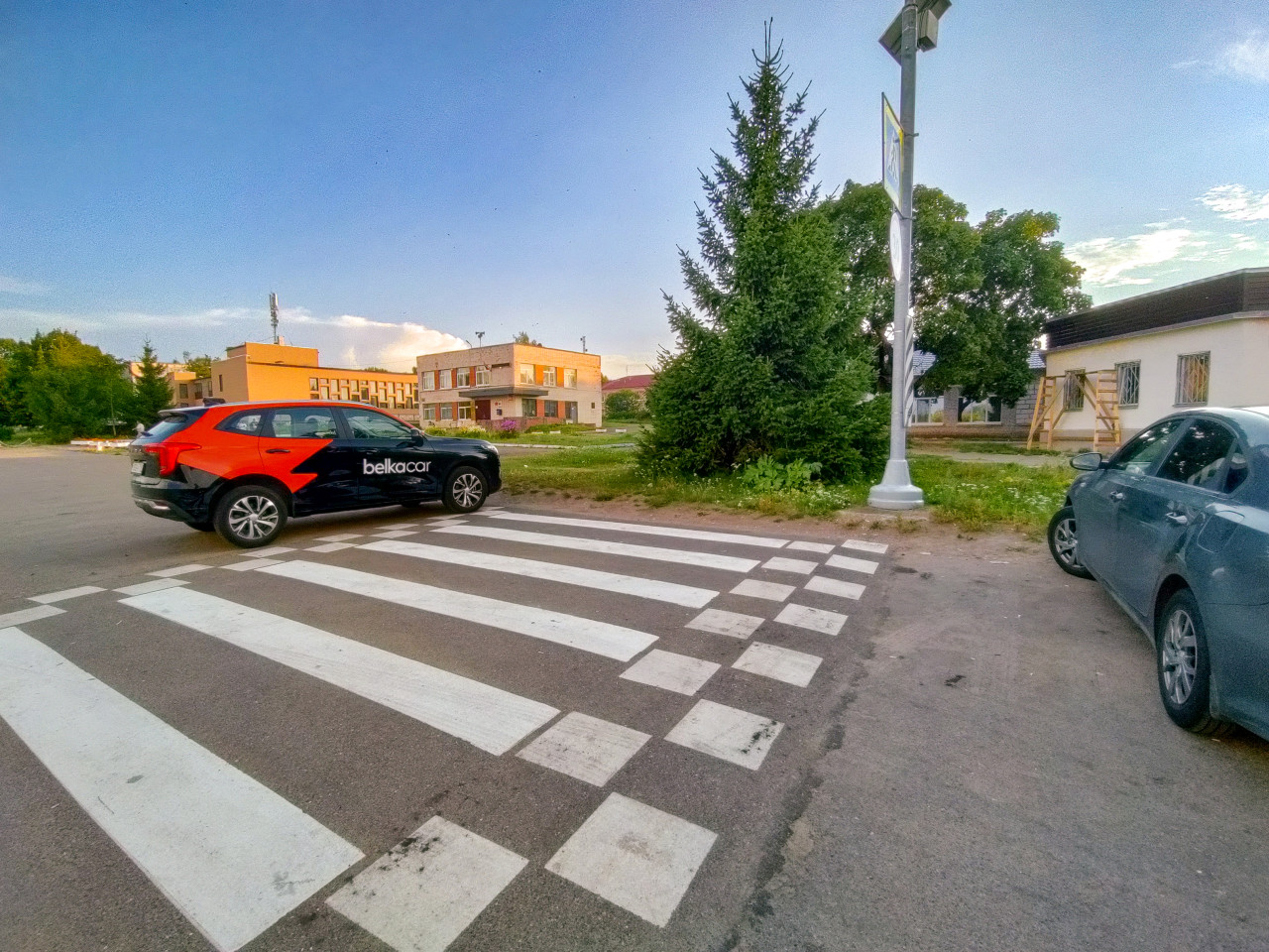 Разметка пешеходного перехода и автомобиль BelkaCar у края проезжей части