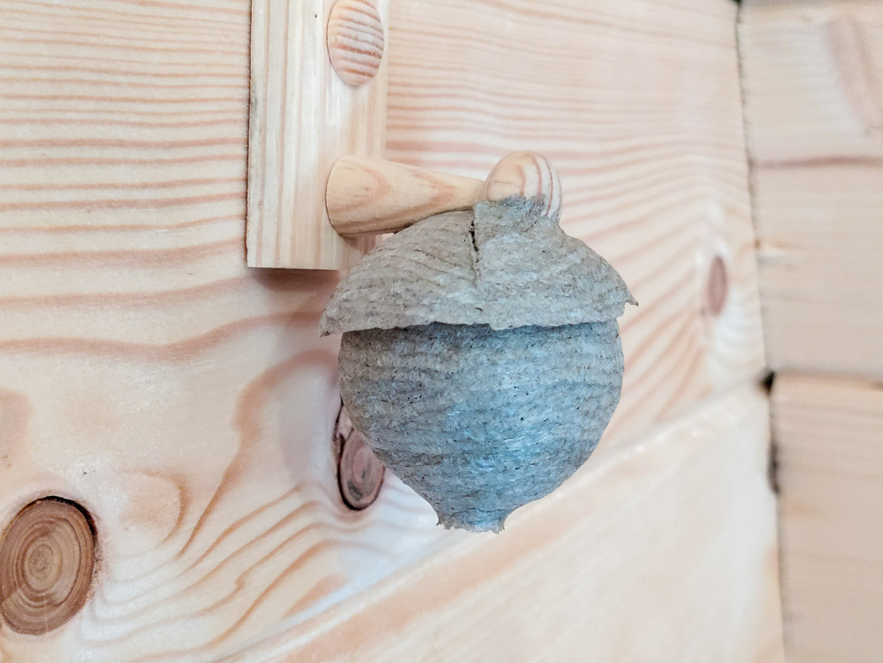объект помещение интерьер стена деревянная стена древесина вагонка текстура крючок крепление баня сауна осиное гнездо природа насекомые осы гнездо ос бумажное гнездо целлюлоза оболочка гнезда входное отверстие вредители опасность укус осы безопасность дезинсекция удаление гнезда частный дом дача деревянная постройка стена из досок сосна фактура дерева сучки крупный план профилактика сезонная активность бытовые риски техника безопасности наблюдение за насекомыми домПохожие фотографии