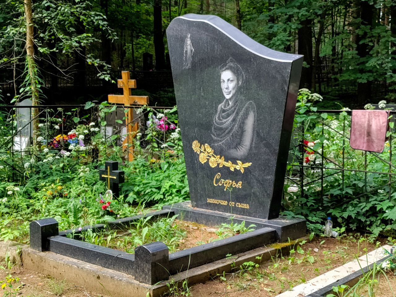 Надгробный памятник из тёмного камня с гравированным портретом женщины и золотистым растительным орнаментом; в центре имя «Софья» и надпись «мамочке от сына». Плита установлена на прямоугольной площадке с бортиком, рядом стоит небольшой крест, а на заднем плане видны деревянные и металлические кресты, цветы и ограды соседних могил. Территория окружена лесом, много зелени и полутень, что создаёт спокойную камерную атмосферу. Фото подходит для тем о персональных мемориалах, кладбищенском искусстве, ритуальной символике и семейной памяти, а также для иллюстраций в материалах о традициях поминовения.