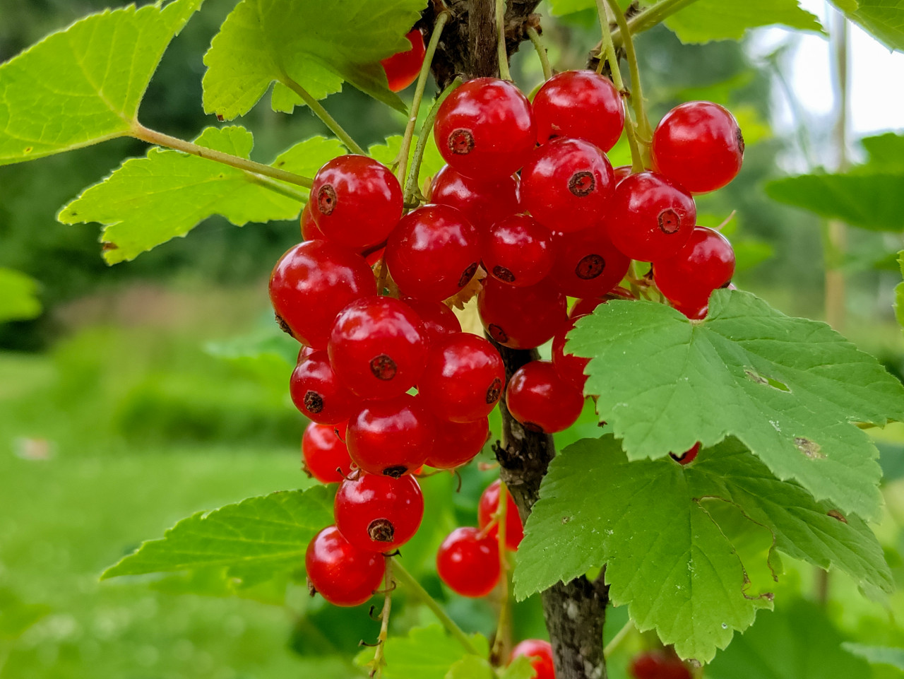 Гроздь красной смородины на фоне зелёной листвы и размытого пейзажа