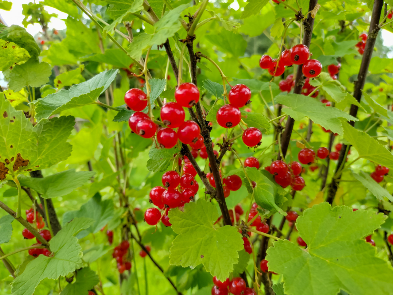 Грозди красной смородины на кусте среди яркой зелени листьев
