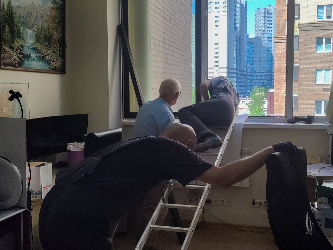 офис интерьер помещение ремонт монтаж обслуживание сервис окно стеклопакет оконная рама лестница инструмент подоконник жалюзи ремонт помещения ремонт окна установка окна рабочие сервисная бригада радиатор интерьер офиса рабочий стол документы коробки офисная техника монитор кресло картина на стене безопасность рабочий процесс город за окном многоэтажные дома высотки дневной свет подрядчикПохожие фотографии