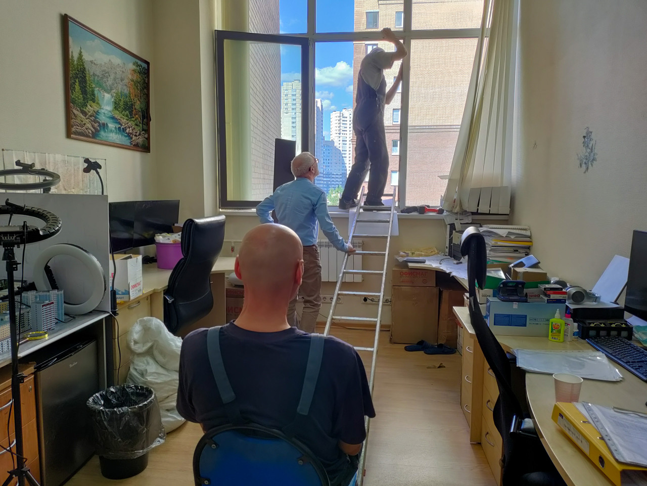 офис интерьер помещение ремонт монтаж обслуживание сервис окно стеклопакет оконная рама лестница инструмент подоконник жалюзи ремонт окна регулировка окна стремянка рабочий мастер безопасность ремонт помещения интерьер офиса рабочие столы документы папки офисная техника монитор коробки радиатор город за окном многоэтажки дневной свет подрядчик технические работыПохожие фотографии