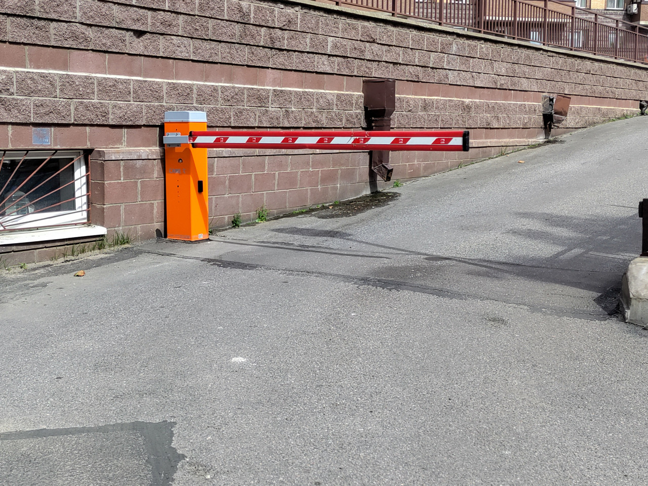 На снимке крупно показан автоматический шлагбаум: оранжевая стойка с приводом и горизонтальная стрела с красно-белой разметкой перекрывают асфальтированный въезд. Рядом видна массивная стена из коричневого облицовочного камня, низкое окно подвального уровня с решёткой и следы потемнений на покрытии у основания. Вдоль стены установлены водосточные элементы, по краю проезда местами пробивается трава. Перспектива уходит на подъём, справа ограждение пандуса. Кадр подходит для тем о контроле доступа, платных парковках, управлении въездом и безопасности территории.
