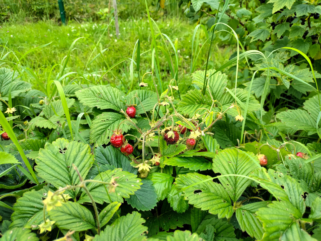 Широкий кадр с кустом земляники: несколько ярко-красных ягод прячутся под листьями, вокруг растёт трава и сорные растения, заметны черешки и цветоносы. Естественная среда и отсутствие декоративной постановки делают изображение документальным, «как есть» на дачном участке. Фотография подойдёт для статей о выращивании земляники, уходе за грядками, биологической защите растений, сезонных работах и здоровом питании. Также её можно использовать в рекламе садовых товаров и в блогах о жизни за городом.