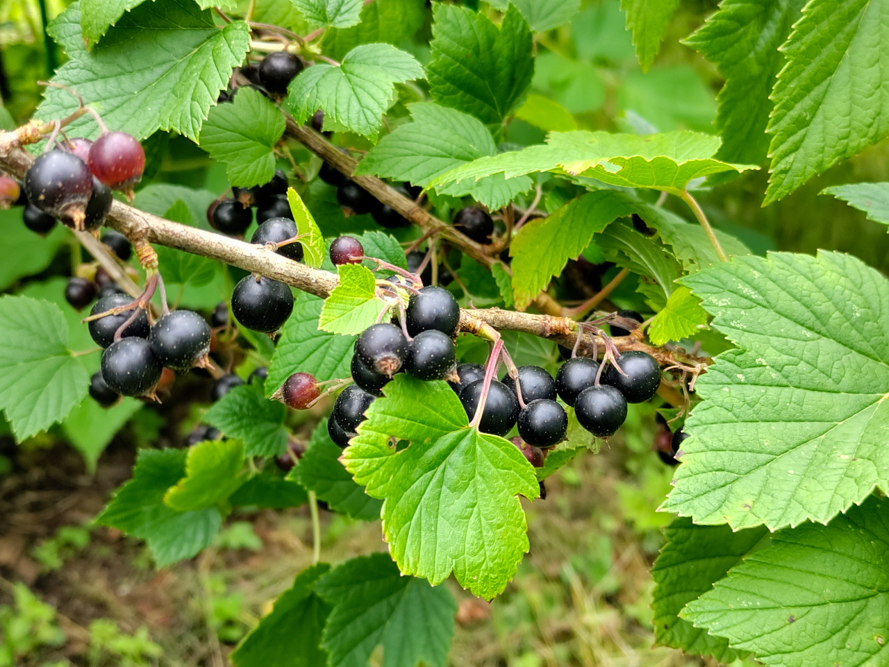 Крупный план ветки чёрной смородины с гроздью ягод: рядом с полностью потемневшими плодами видны красноватые недозрелые ягоды, тонкие плодоножки и остатки чашелистиков. Кадр заполнен зелёной листвой с зубчатым краем и выраженными жилками, на поверхности листьев читается фактура. Фон мягко размытый, угадываются травы и зелёный массив садового участка. Фото подходит для материалов о дачном хозяйстве, выращивании ягод, сезонных продуктах, витаминах, рецептах варенья и здоровом питании.