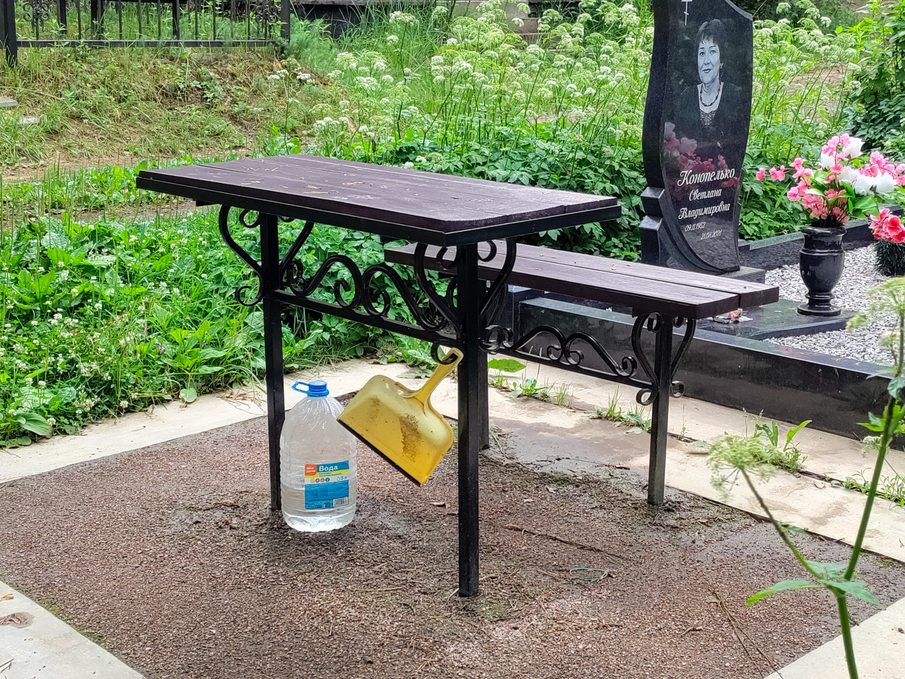 кладбище захоронение могила надгробие памятник траур память поминальный стол лавка стол и скамейка место для поминовения ритуал уход за могилой уборка совок инструменты для уборки бутыль с водой пластиковая тара гранитный памятник портрет каменная ваза искусственные цветы цветочная композиция площадка бетонная дорожка зелёная трава зонтичные растения кладбищенский быт ритуальные услуги мемориал тишинаПохожие фотографии