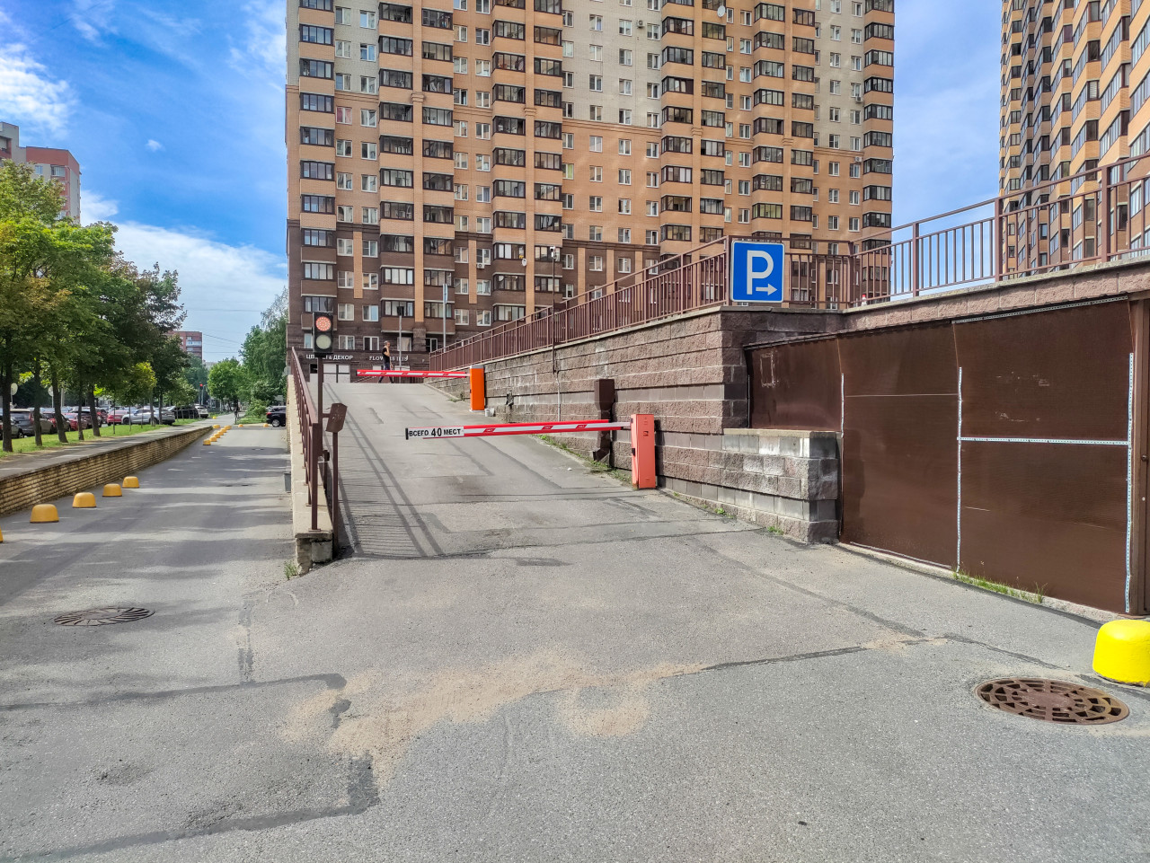 На фото показан въезд на закрытую парковку у многоэтажного жилого дома: асфальтированный подъём ведёт вверх между подпорной стеной и ограждением. На проезде установлен автоматический шлагбаум с оранжевой стойкой и красно-белой стрелой, рядом закреплён синий дорожный знак «P». На полотне видны следы ремонта и песчаные пятна, внизу кадра заметны люки и жёлтые ограничители. Слева тянется тротуар с деревьями и парковочными местами вдоль улицы. Снимок подходит для материалов о городской парковочной инфраструктуре, организации дворового движения и платных стоянках.