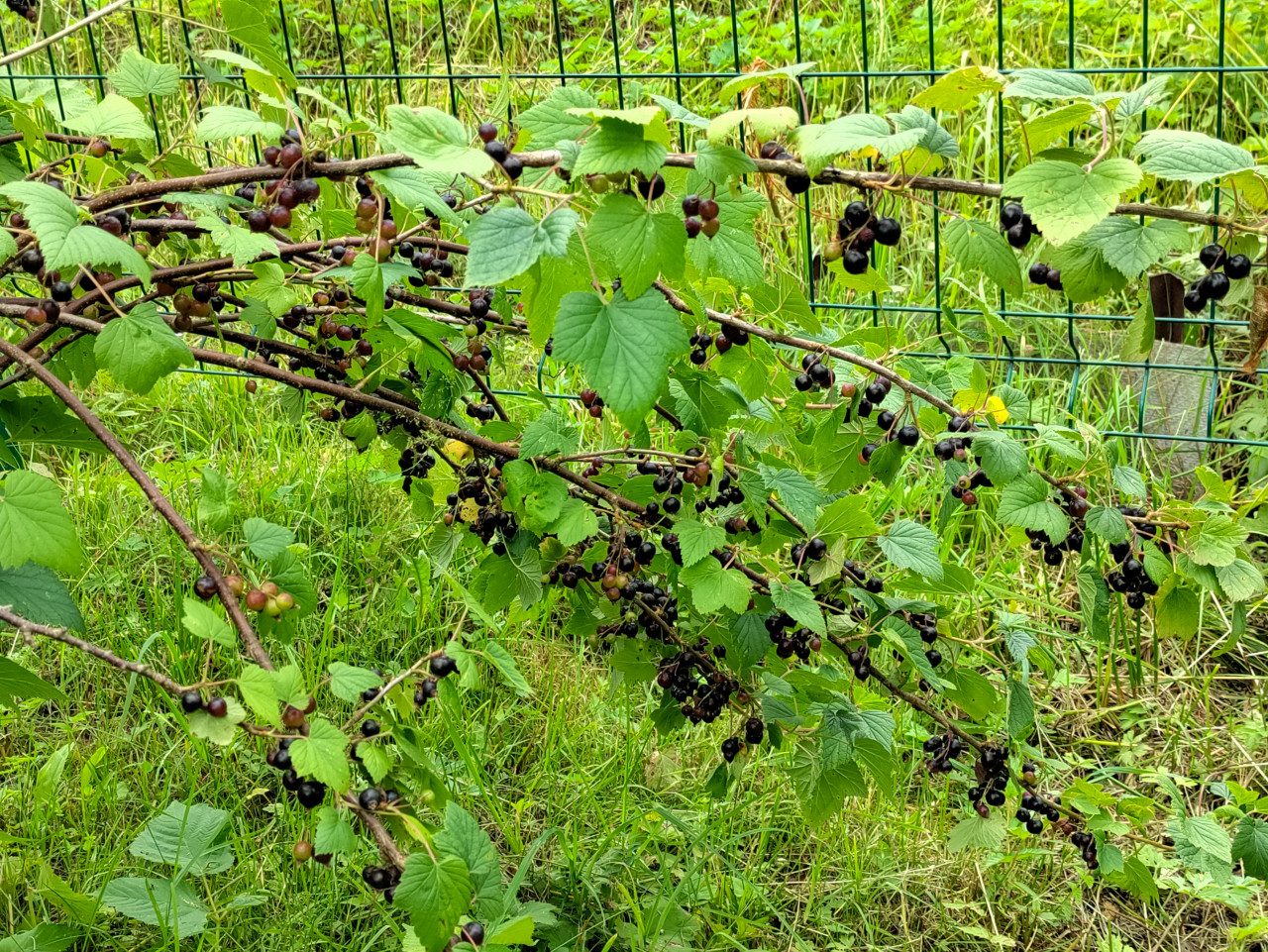 Куст чёрной смородины с длинными плодоносящими ветвями у садовой ограды
