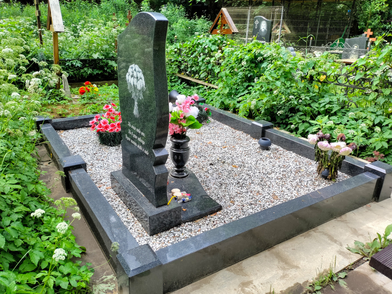 кладбище захоронение могила надгробие памятник траур память гранит гравировка эпитафия ограда мраморная крошка ритуальные традиции поминовение искусственные цветы венок ваза для цветов благоустройство уход за могилой религия кресты соседние могилы зелёная растительность сорняки летняя зелень сельское кладбище тихое место траурная символикаПохожие фотографии