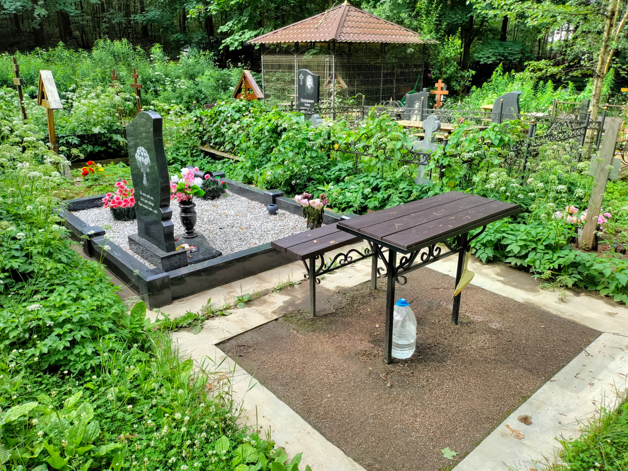 кладбище захоронение могила надгробие памятник траур память лес зелёная растительность гранитный памятник щебень каменная ваза искусственные цветы цветочная композиция поминальный стол площадка бутыль с водой бетонные дорожки кованая ограда деревянные кресты навес металлическая сетка кровля домики для птиц кормушка ритуал поминовение уход за захоронением благоустройство территории тихое местоПохожие фотографии