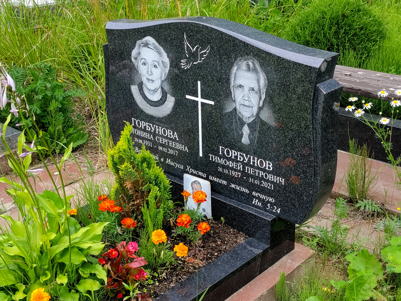 кладбище захоронение могила надгробие памятник траур память гранит полированный гранит двойной памятник портреты гравировка крест православный крест религиозная надпись Горбунова Антонина Сергеевна Горбунов Тимофей Петрович даты жизни 1931 2017 1927 2021 клумба бархатцы цветы на могиле лавка поминовение ритуальные традицииПохожие фотографии