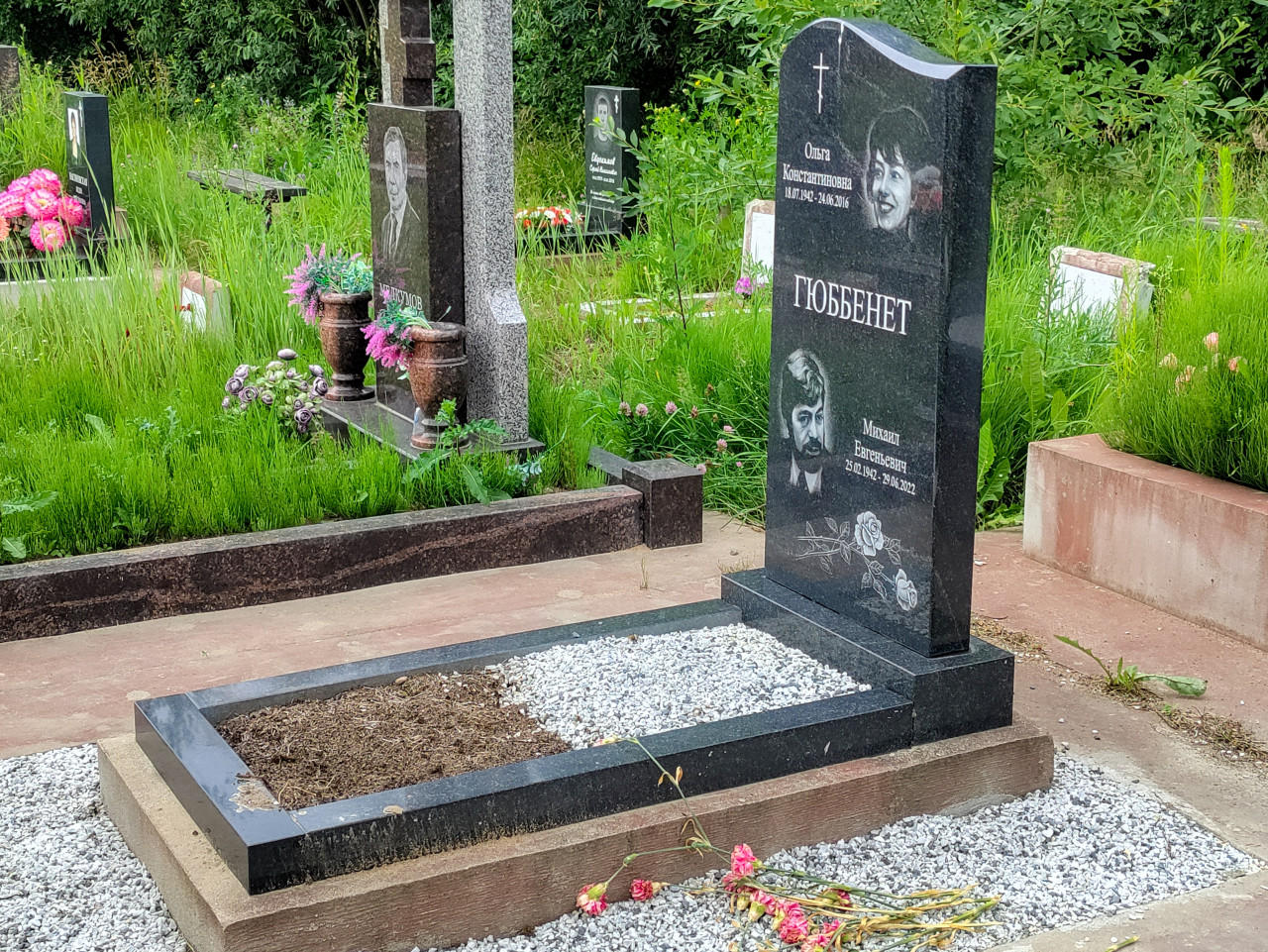 кладбище захоронение могила надгробие памятник траур память гранит чёрный гранит фамилия Гюббенет портреты гравировка крест православный крест имена на памятнике Ольга Константиновна Михаил Евгеньевич даты жизни 1942 2016 2022 гравий белый щебень отсыпка рамка могилы грунт ритуальные традиции поминовение вазоны соседние могилы высокая трава зелёные зарослиПохожие фотографии