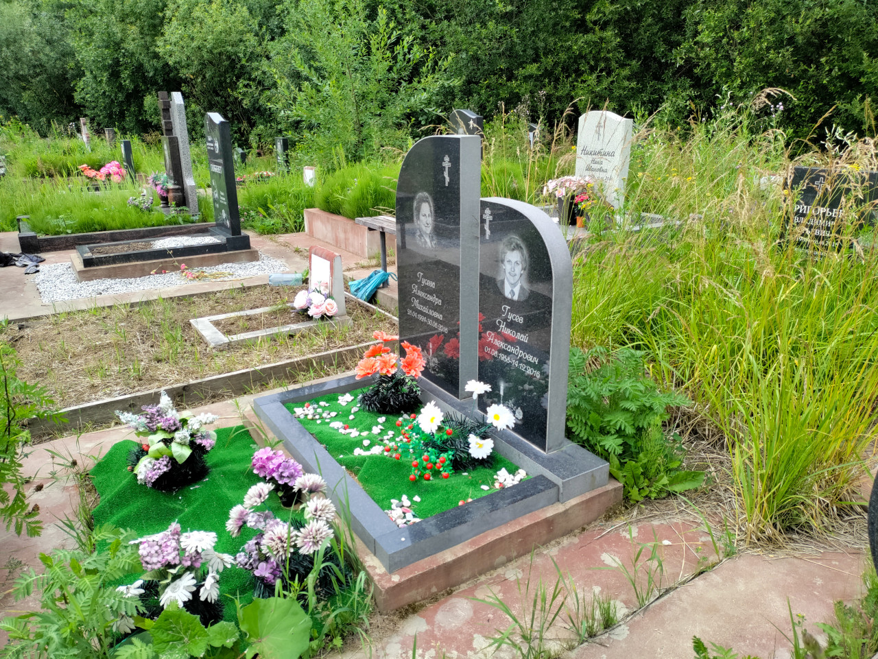кладбище захоронение могила надгробие памятник траур память два памятника портрет на памятнике гравировка крест православный крест Гусева Александра Михайловна Гусев Николай Александрович даты жизни 1994 2016 1958 семейная могила газонное покрытие зелёный ковёр декоративная крошка белый щебень искусственные цветы венок ритуальные традиции поминовение участок кладбища высокая траваПохожие фотографии