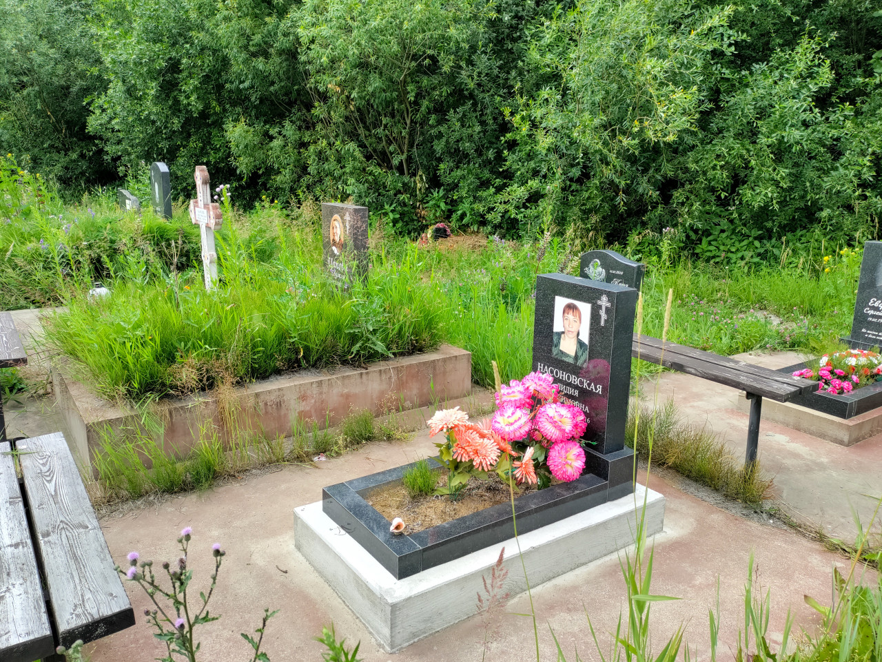 Сцена на кладбище в период активной зелени: оформленный могильный участок с невысоким гранитным памятником и горизонтальной плитой, на которой лежит букет искусственных цветов. Рядом видны лавочки для посетителей, бетонные дорожки и бордюры, высокая трава и кустарники по краям участка. На фоне расположены другие надгробия, кресты и ограждения, создающие характерный вид мемориального пространства. Фото подойдёт для иллюстраций о семейной памяти, посещении кладбищ, уходе за захоронениями и социальных темах.
