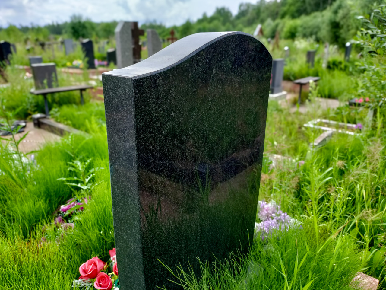 кладбище захоронение могила надгробие памятник траур память гранитная стела полированный гранит тёмный камень мемориал поминовение похороны ритуальные традиции ритуальные услуги уход за могилой благоустройство участка искусственные цветы венок высокая трава лето зелёная растительность лавочка кладбищенские ряды спокойствие тихое место семейная память каменная обработкаПохожие фотографии