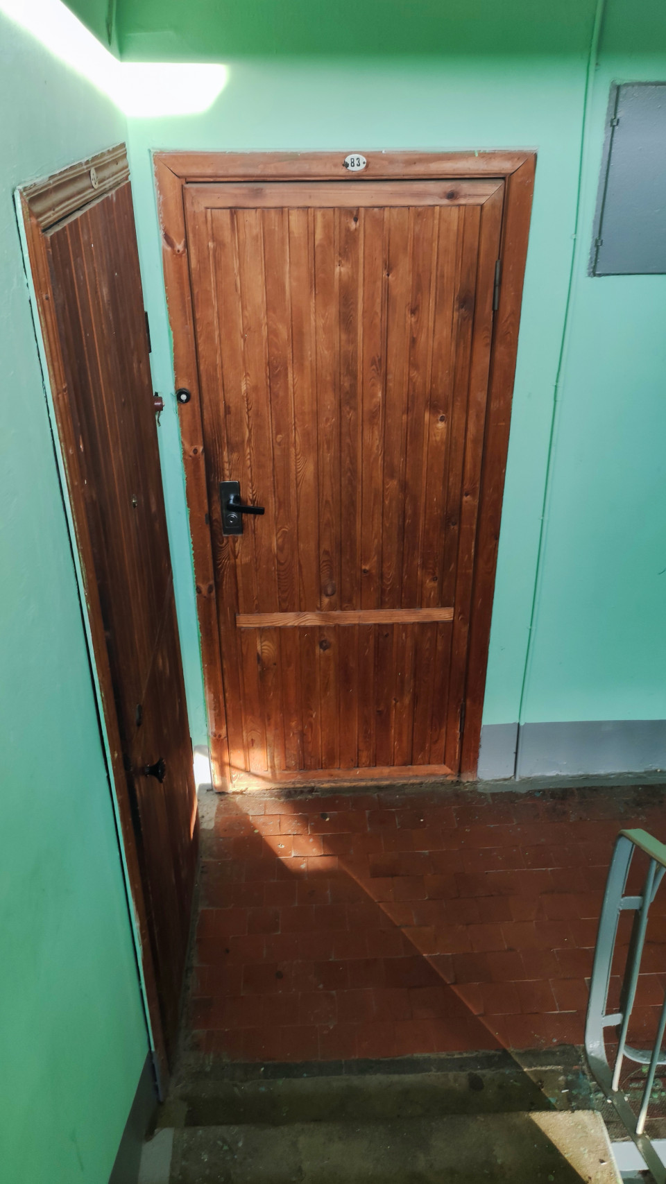 Снимок сделан 23 января 2026 года днём на лестничной площадке многоквартирного дома. В центре кадра деревянная дверь с табличкой «83», установлен замок и ручка; рядом видна вторая дверь, частично попавшая в кадр. Стены окрашены в зелёный цвет, внизу серый цоколь, на полу коричневая плитка и ступени, справа фрагмент перил. Солнечный луч даёт резкую световую полосу и тени на полу. Фото подходит для тем о жилой недвижимости, подъездах и общих зонах, эксплуатации домов и типовой архитектуре.