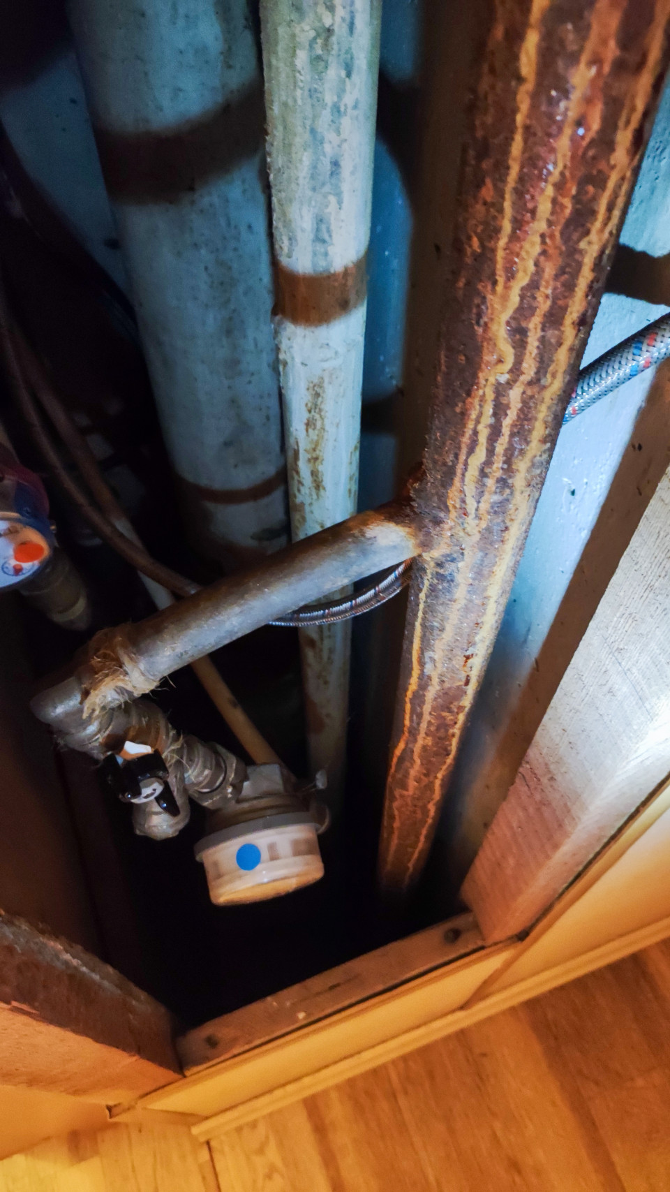 Отвод водопроводной трубы с вентилем и следами коррозии