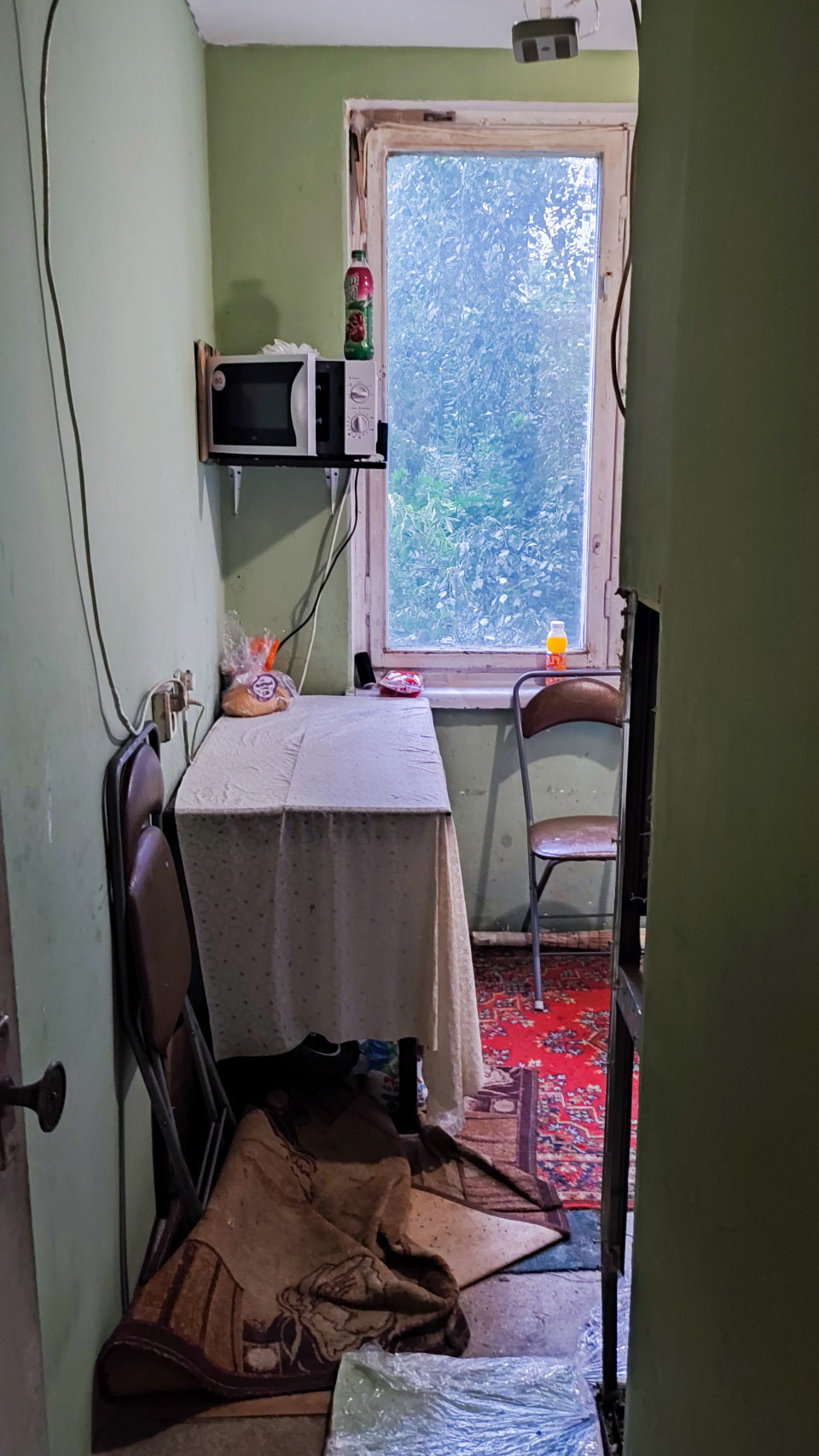 Стена с многочисленными повреждениями и открытым проёмом в соседнее помещение
