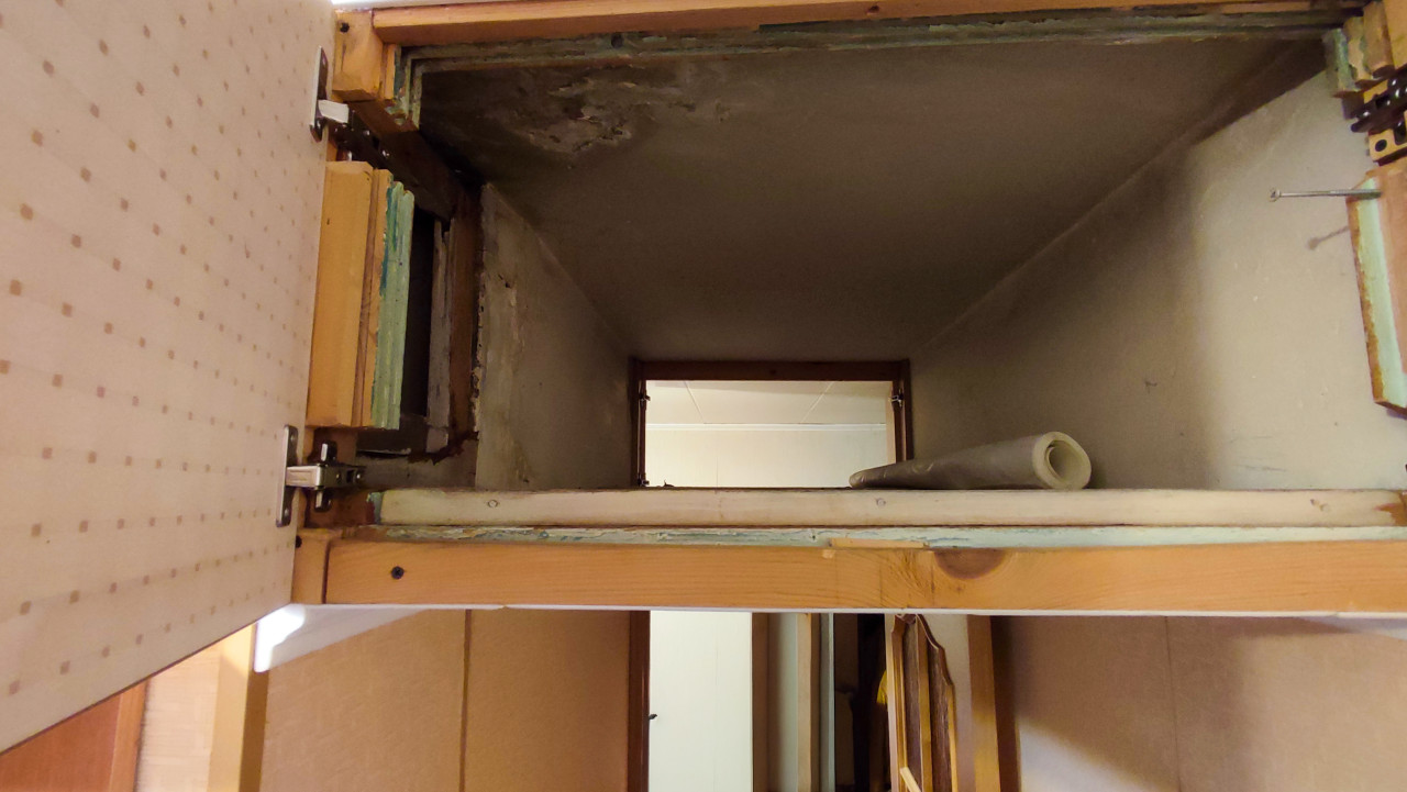 Санкт-Петербург, Россия, июль 2024 года. Антресоль над дверным проёмом снята с фронта: распахнуты дверцы, видны мебельные петли, деревянный каркас и следы старой отделки. Внутри глубокая ниша, на потолочной поверхности заметны тёмные пятна, отслоения и участки повреждённой штукатурки, на полке лежит свёрнутый материал. В глубине кадра виден прямоугольный проём в соседнее помещение и часть коридора. Фотография подходит для иллюстраций о ремонте квартир, выявлении дефектов, износе конструкций и бытовых условиях жилья.