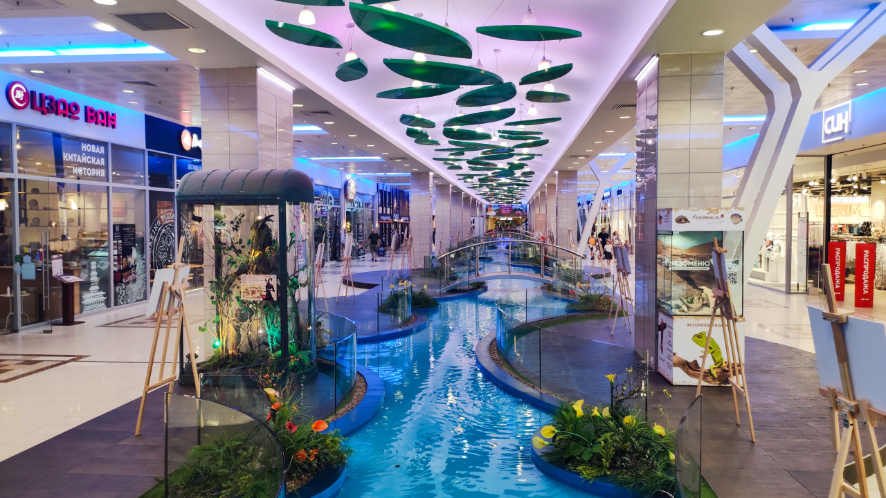 торговый центр интерьер галерея молл магазины витрины коридор пешеходная зона искусственный канал вода декоративный ручей мостик стеклянные ограждения подсветка светодиодный свет дизайнерский интерьер оформление растения озеленение декор выставочные мольберты реклама городской досуг шопинг коммерческая недвижимость архитектура интерьера современное пространствоПохожие фотографии