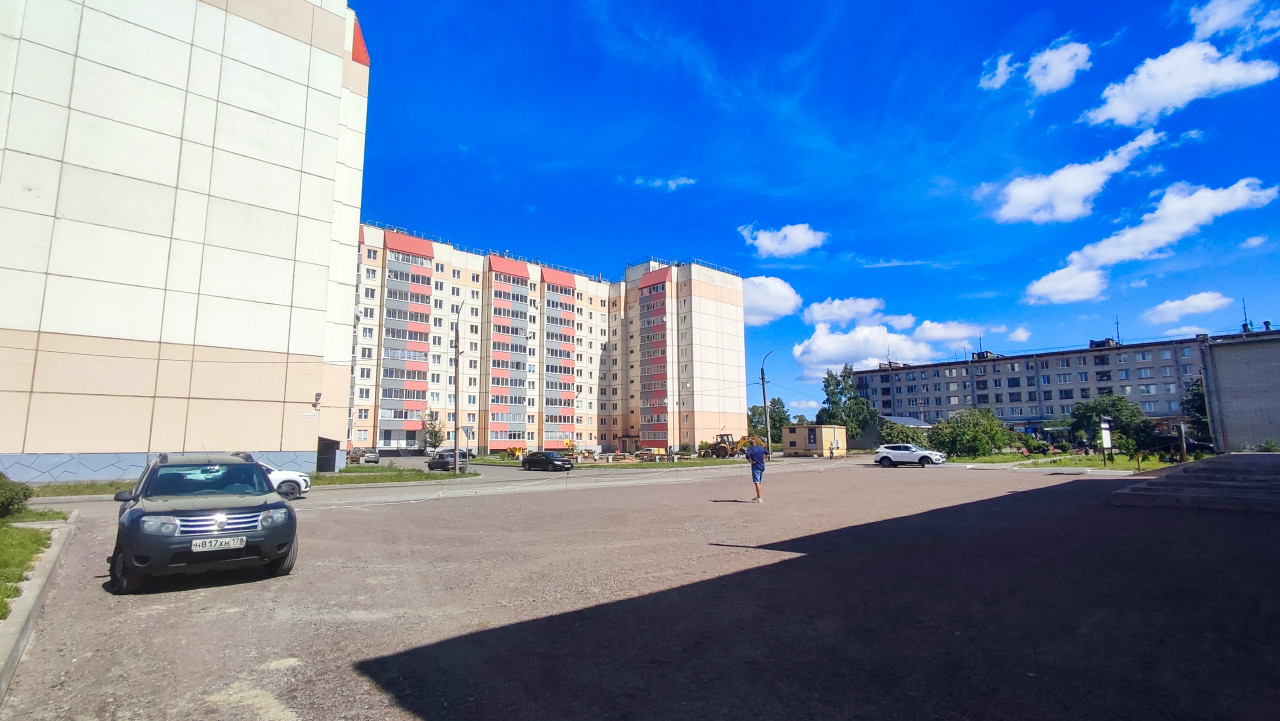 Асфальтированный двор с клумбой и припаркованными автомобилями