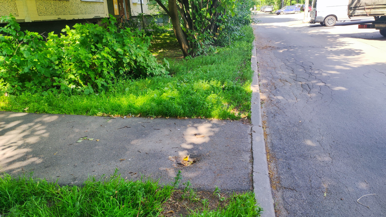 Асфальтированная дорожка с лужей во дворе жилого квартала