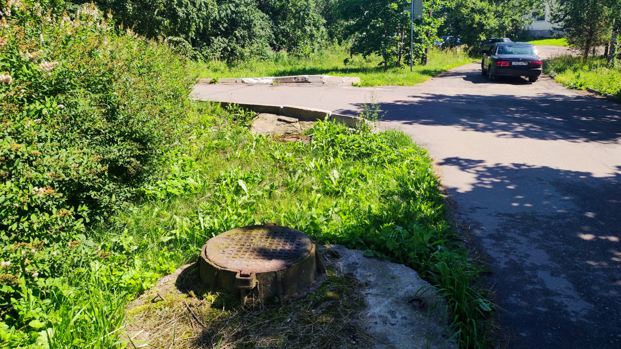 Выступающий люк на дворовой дороге рядом с жилым домом