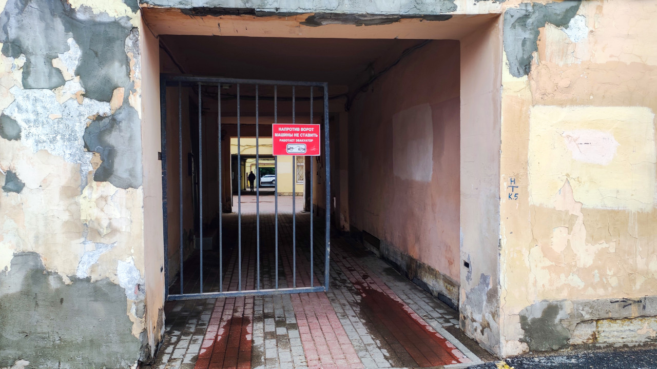 Дворовая дорога с люком ливневки и прохожими