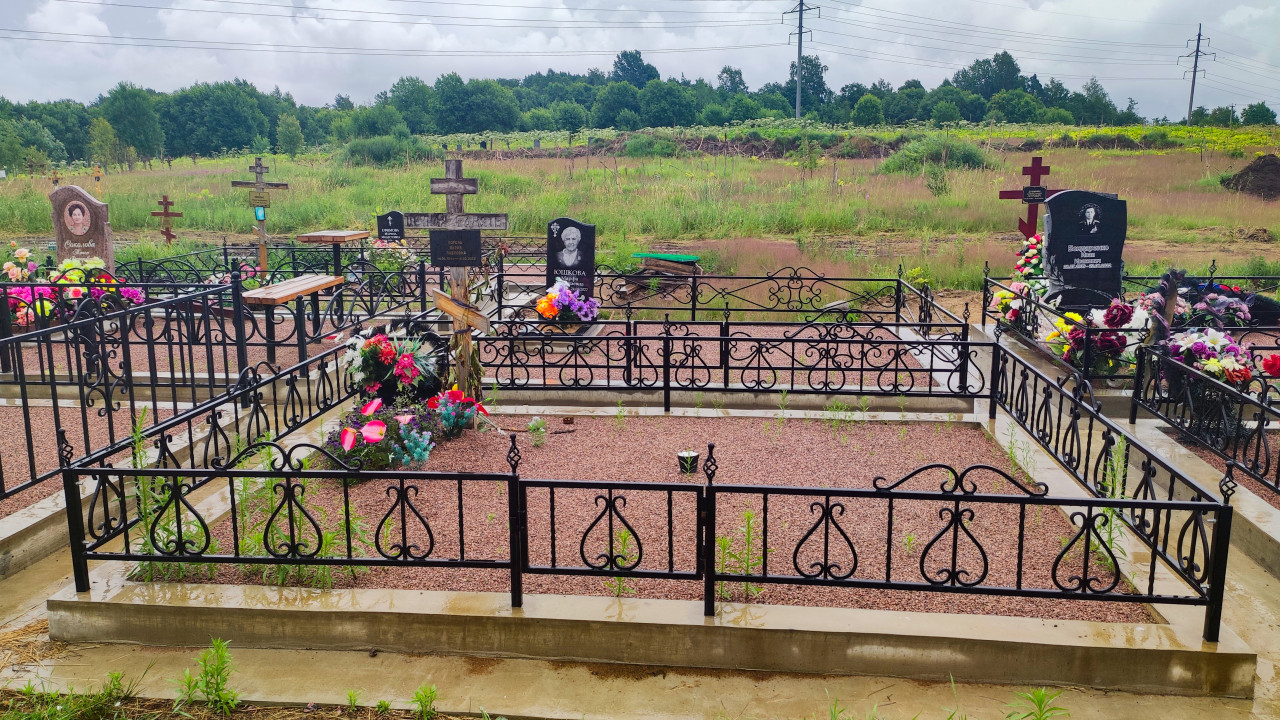 Кованые ограды и гранитные памятники на кладбищенском участке среди леса