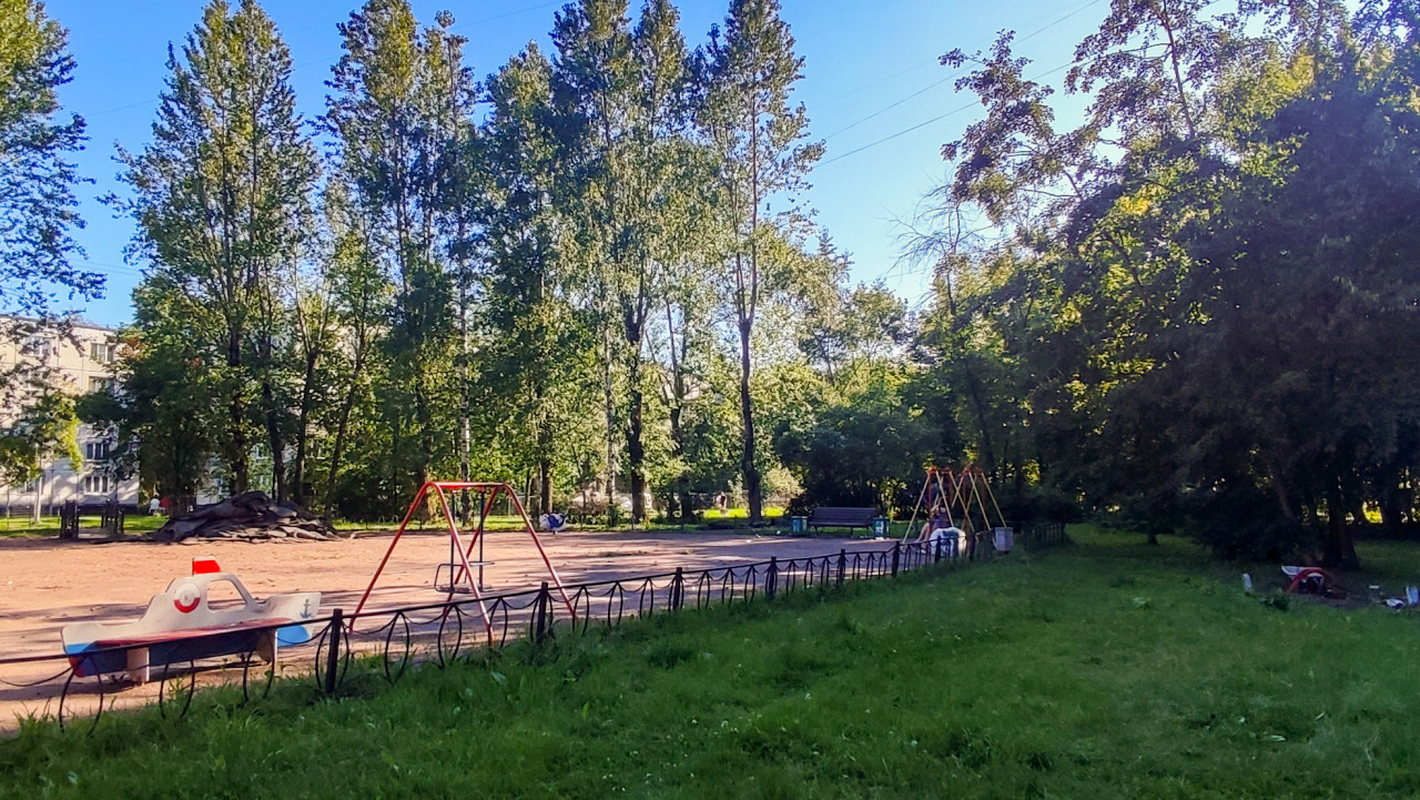 Зелёный двор с тропинкой, кустарниками и жилыми домами
