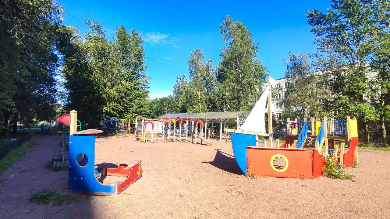 Разобранная песочница из брёвен на детской площадке во дворе жилого района