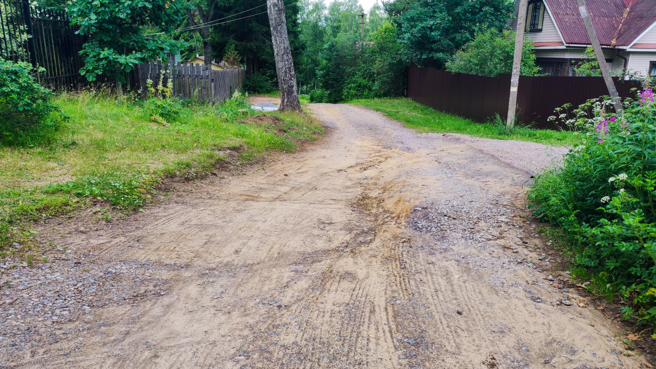 Снимок показывает развилку на грунтовой дороге: на песчаном покрытии видны следы шин, размывы и влажные участки после осадков. Дорога расходится в две стороны, вдоль обочин растёт яркая зелень и кустарники. На заднем плане заметны заборы и ворота частных участков, а также деревья и небольшие строения, что создаёт типичный вид пригородной или дачной местности. Кадр подходит для материалов о загородной инфраструктуре, состоянии грунтовых дорог, дачных посёлках, навигации и дорожных работах.